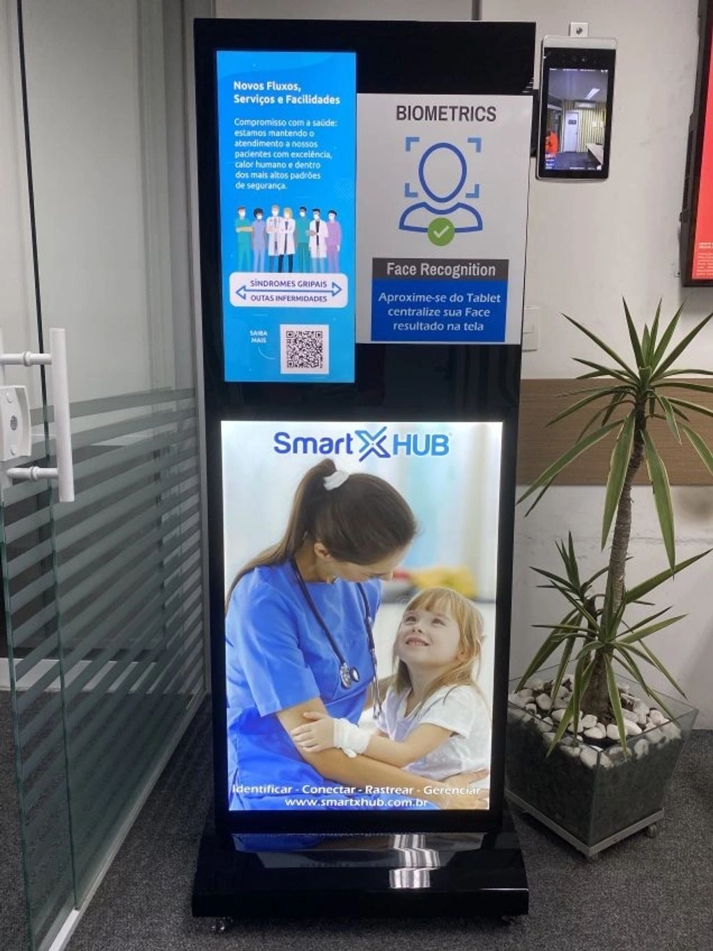 Tótem biométrico conectado al SmartX HUB Cloud System con amplio panel publicitario.